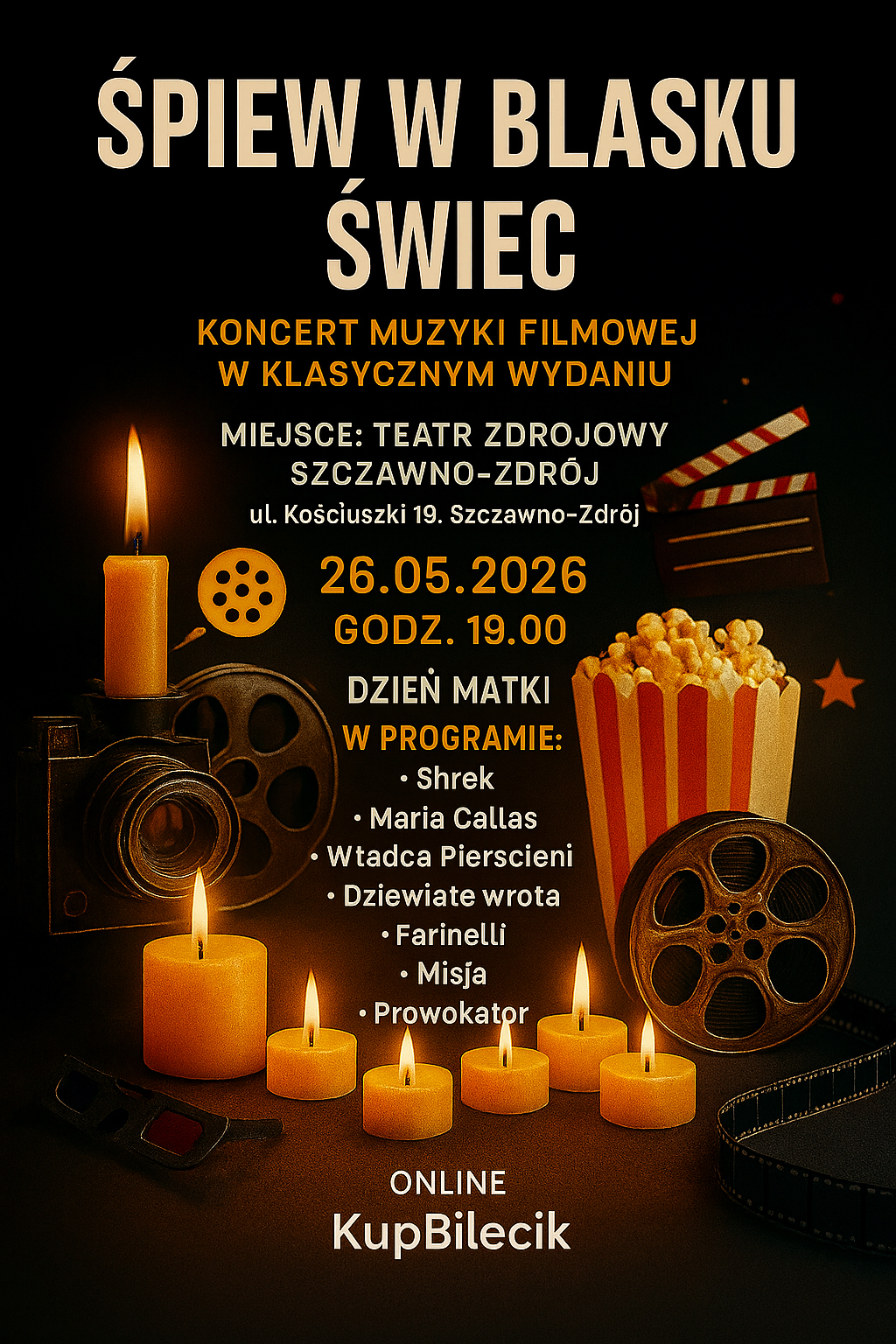 Zapraszamy na niezwykły wieczór, w którym magia muzyki filmowej spotka się z nastrojem blasku świec. "Śpiew w blasku świec" to podróż przez najpiękniejsze utwory stworzone dla kina - zarówno te napisane specjalnie na potrzeby filmów, jak i kompozycje, które na stałe wpisały się w historię małego i dużego ekranu.